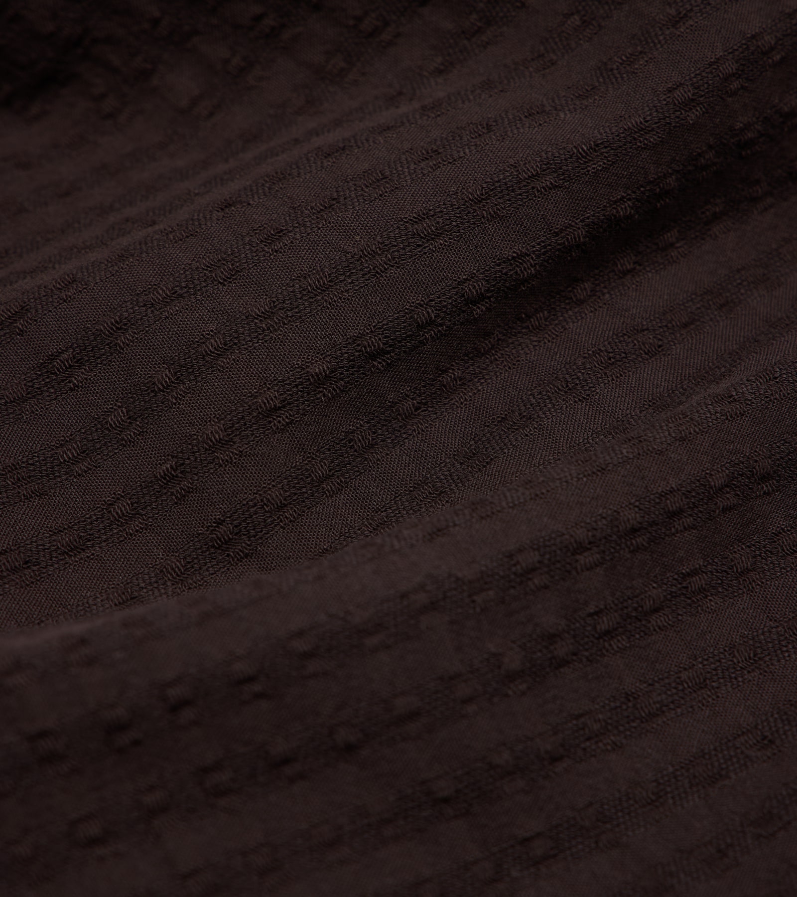 A deep, dark brown textured fabric with a distinct waffle appearance. Its vertical striped pattern enhances depth and dimension, making this mid-weight fabric from Portugal stand out.